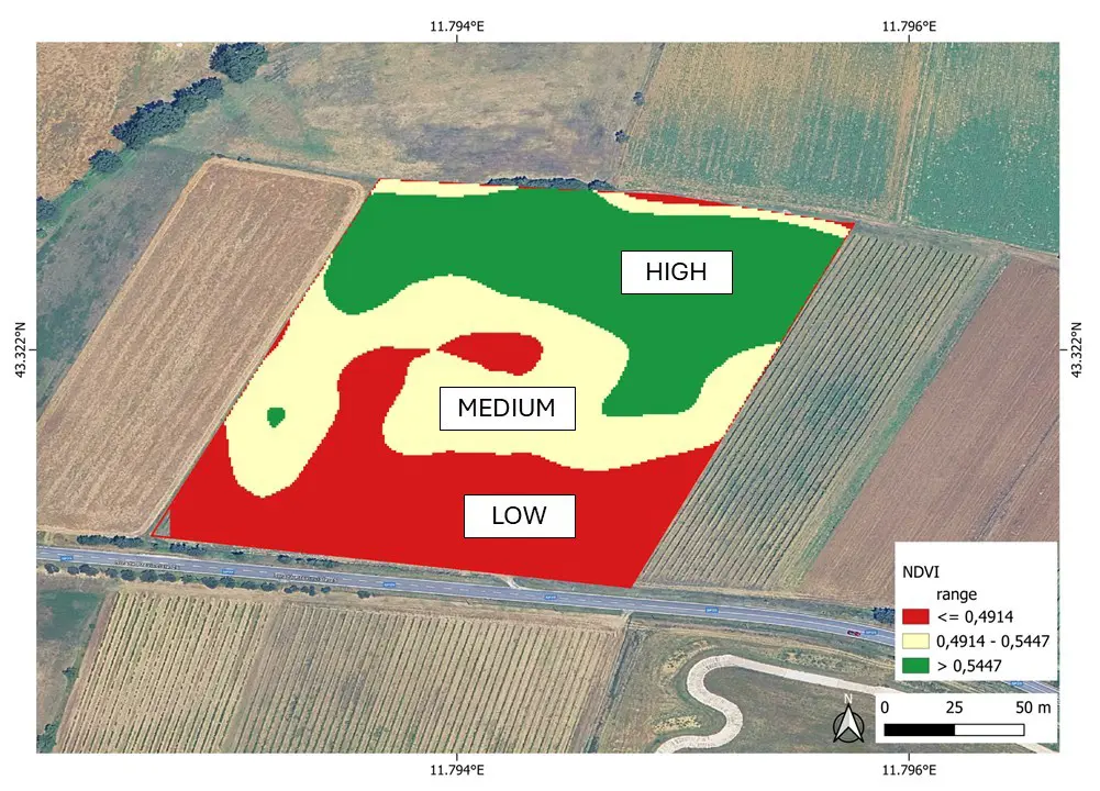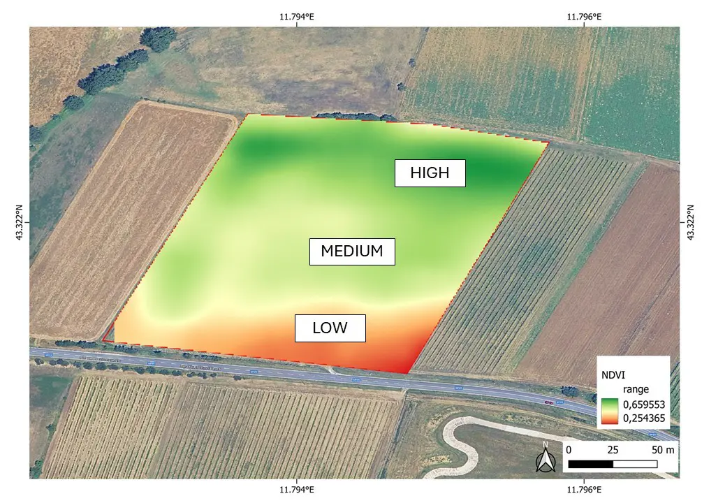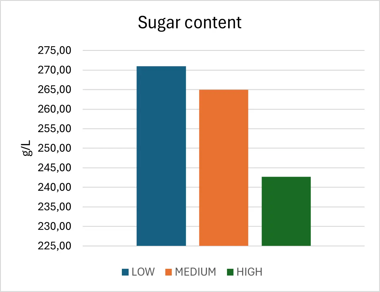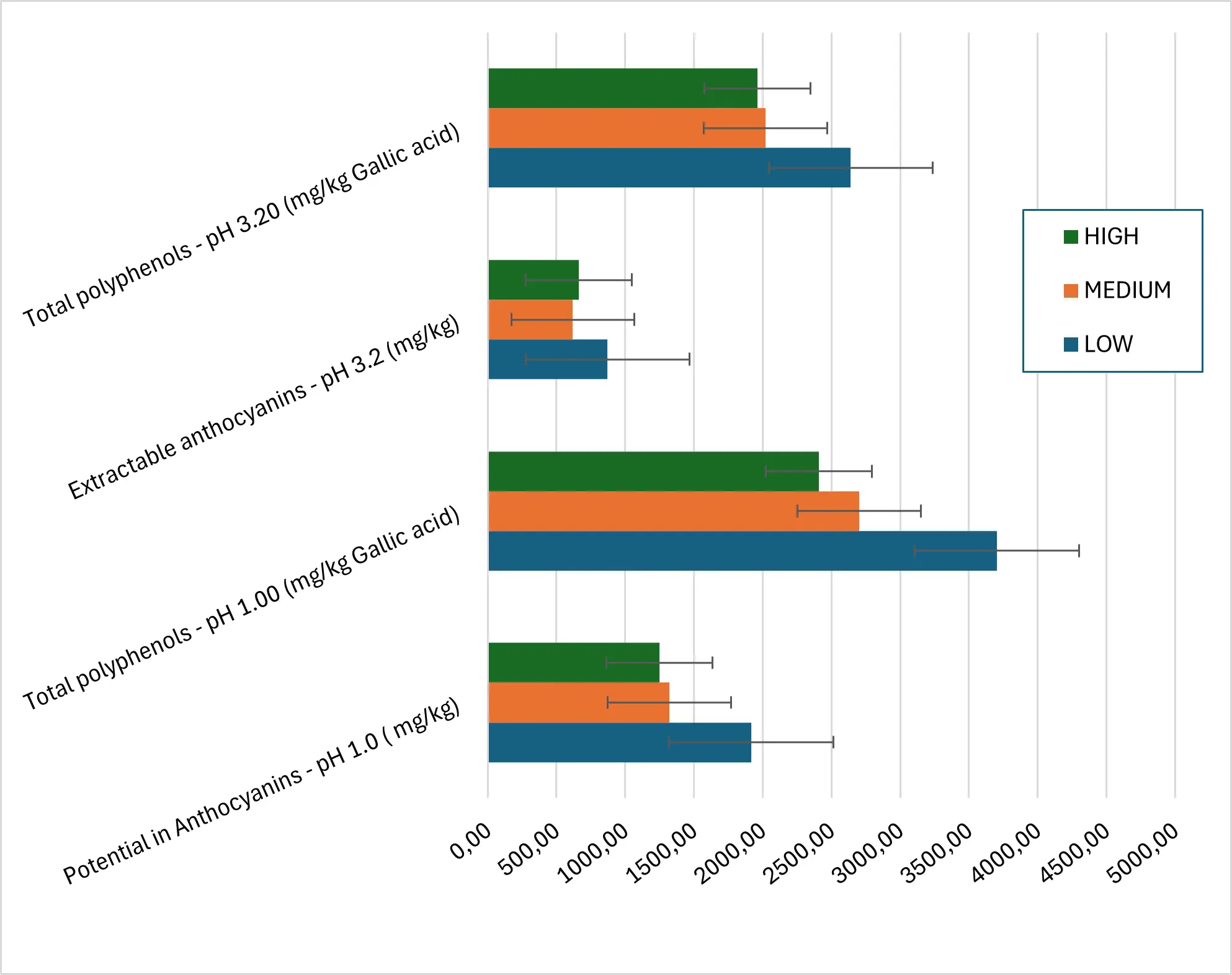 Let’s take the vineyard in the image as an example: there are areas with uneven vegetative vigor (highlighted by the NDVI index) that lead us to divide the vineyard into three areas, one with low vigor, one with medium vigor, and one with high vigor. These areas are not only differentiated by vegetative vigor, but also by the characteristics of the grapes. If we look at the graphs, this is evident!